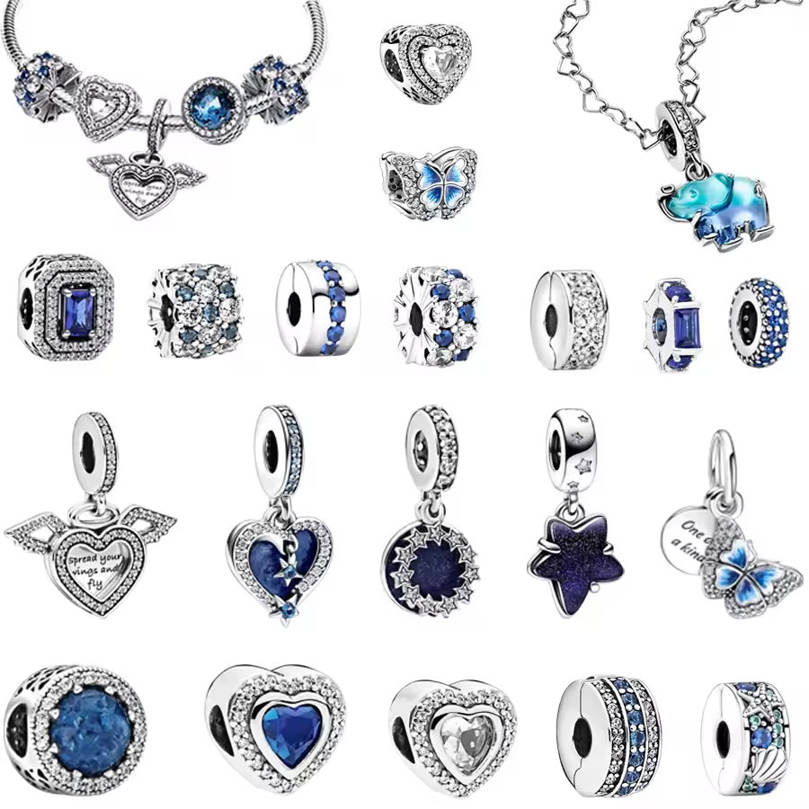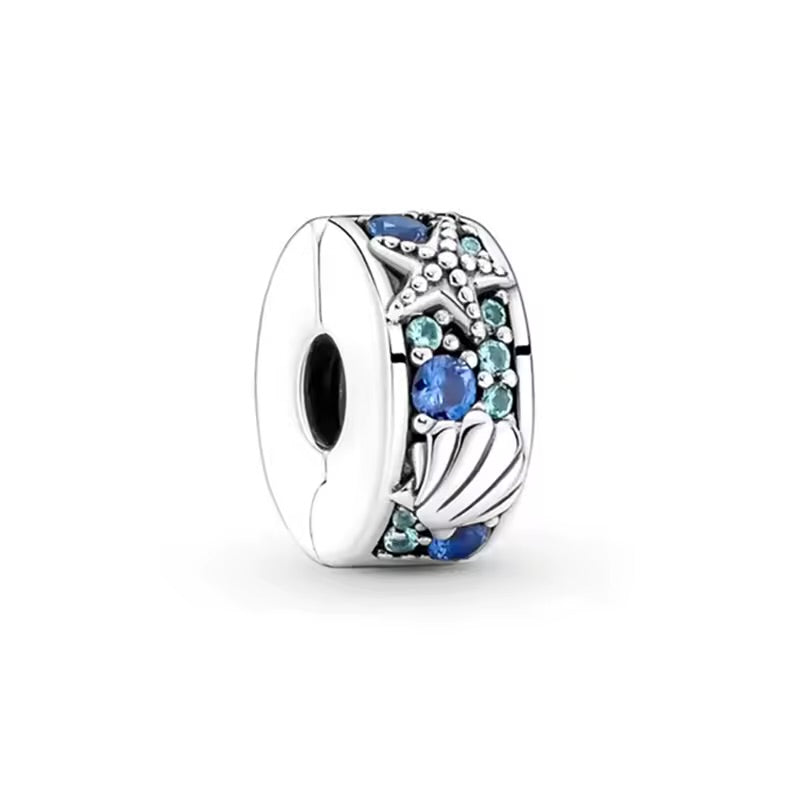 Елегантна висулка за гривни тип Pandora, изработена от сребрист метал със сини и тюркоазени камъни. Декорирана с морска звезда и мида, вдъхновени от морския свят. Свеж и стилен акцент, който придава лятно настроение на всяка гривна.🌊⭐