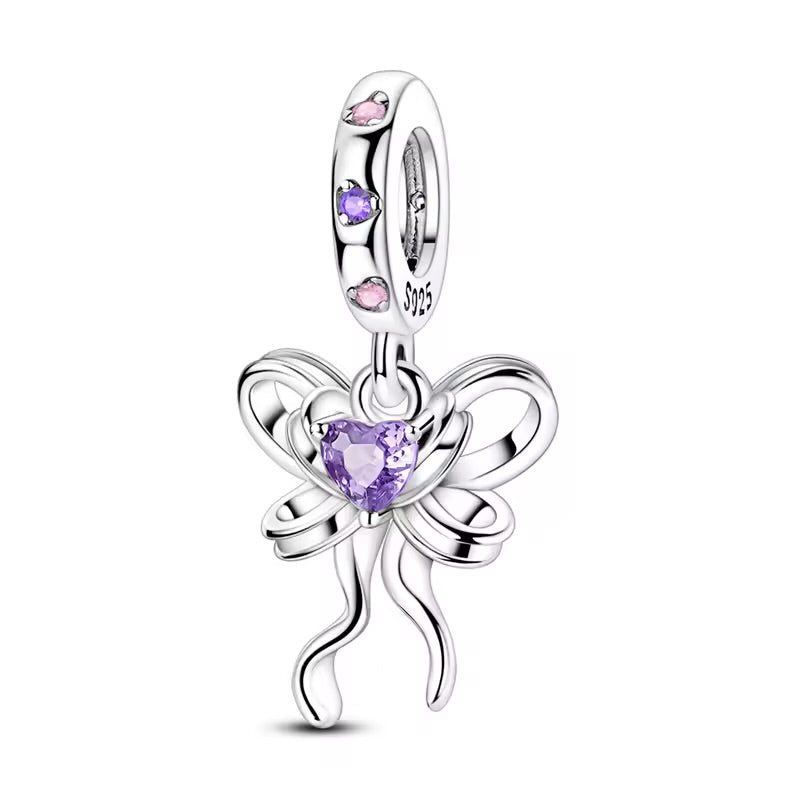Нежна висулка за гривни тип Pandora, изработена от сребрист метал. Оформена като елегантна панделка с лилав кристал във формата на сърце и фини розови и лилави камъни. Романтичен и изискан акцент, който придава фин блясък на всяка гривна.🎀💜