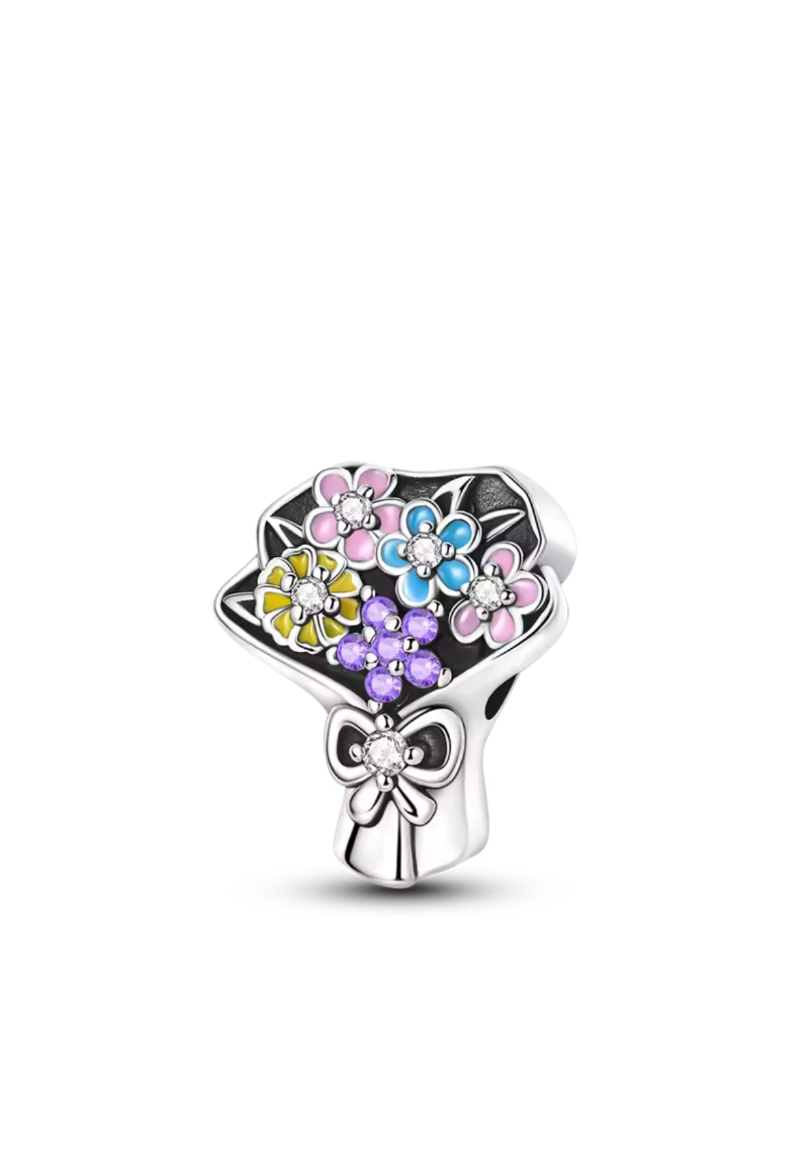 Нежна висулка за гривни тип Pandora, изработена от сребрист метал. Декорирана с релефен букет от цветя в пастелни цветове и фини блестящи камъни. Романтичен и елегантен акцент, който придава свежест и стил на всяка гривна.💐