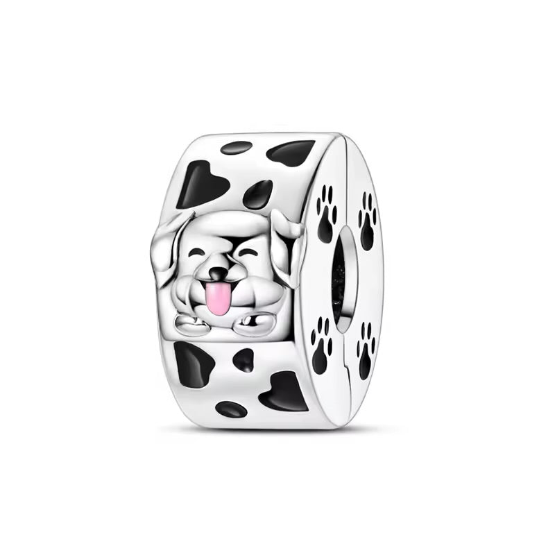 Очарователна висулка за гривни тип Pandora, изработена от сребрист метал. Декорирана с релефно кученце с игриво изражение, черни петънца и лапички отстрани. Стилен и забавен акцент, подходящ за любителите на животни и за допълване на всяка гривна.🐾✨