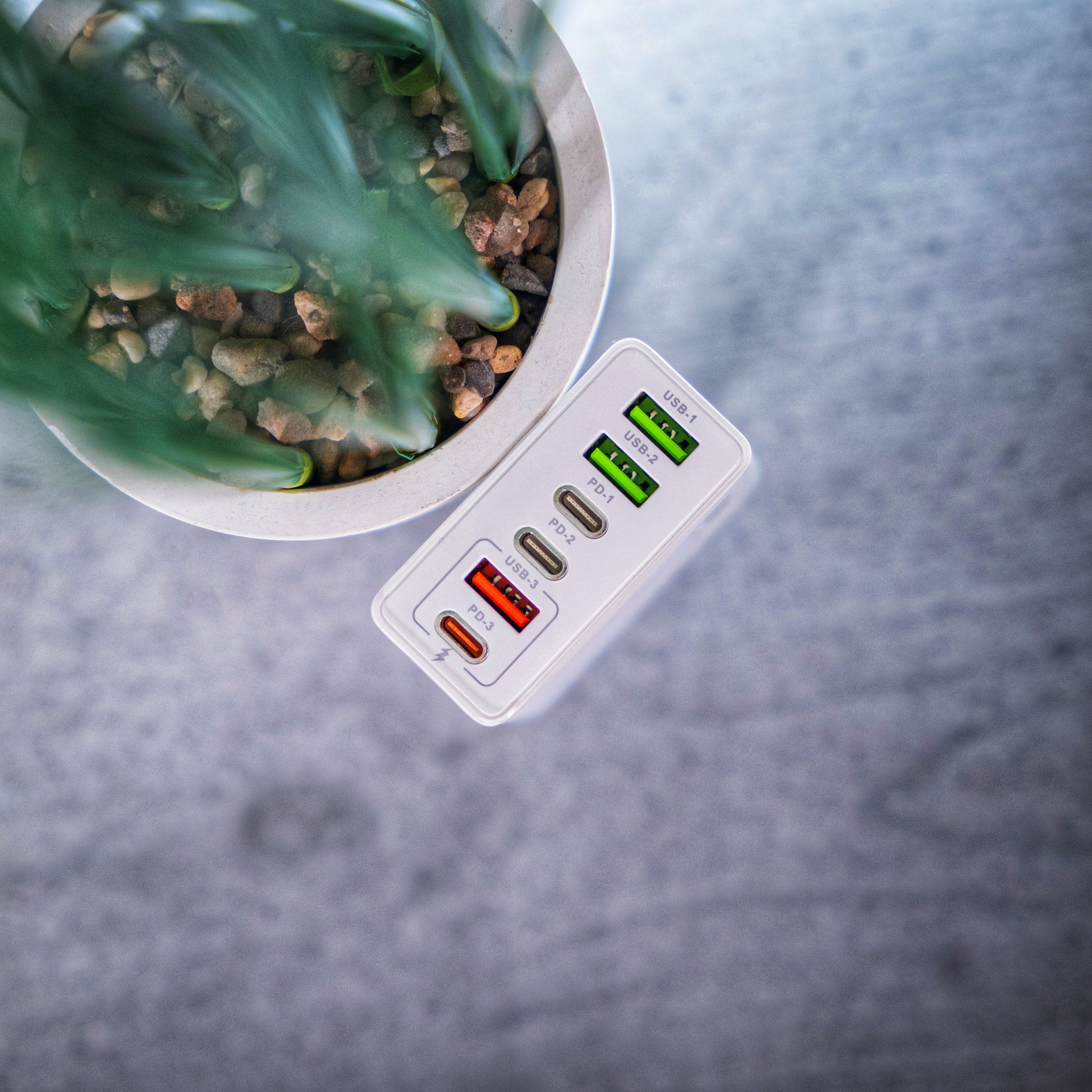 Зареждай всичките си устройства едновременно с това супер мощно 200W зарядно с 6 порта – 3x USB и 3x Type-C (PD). Поддържа бързо зареждане за телефони, лаптопи, таблети и аксесоари, като автоматично разпознава устройството и подава оптималната мощност. Компактният и елегантен дизайн го прави идеален както за дома, така и за пътуване.